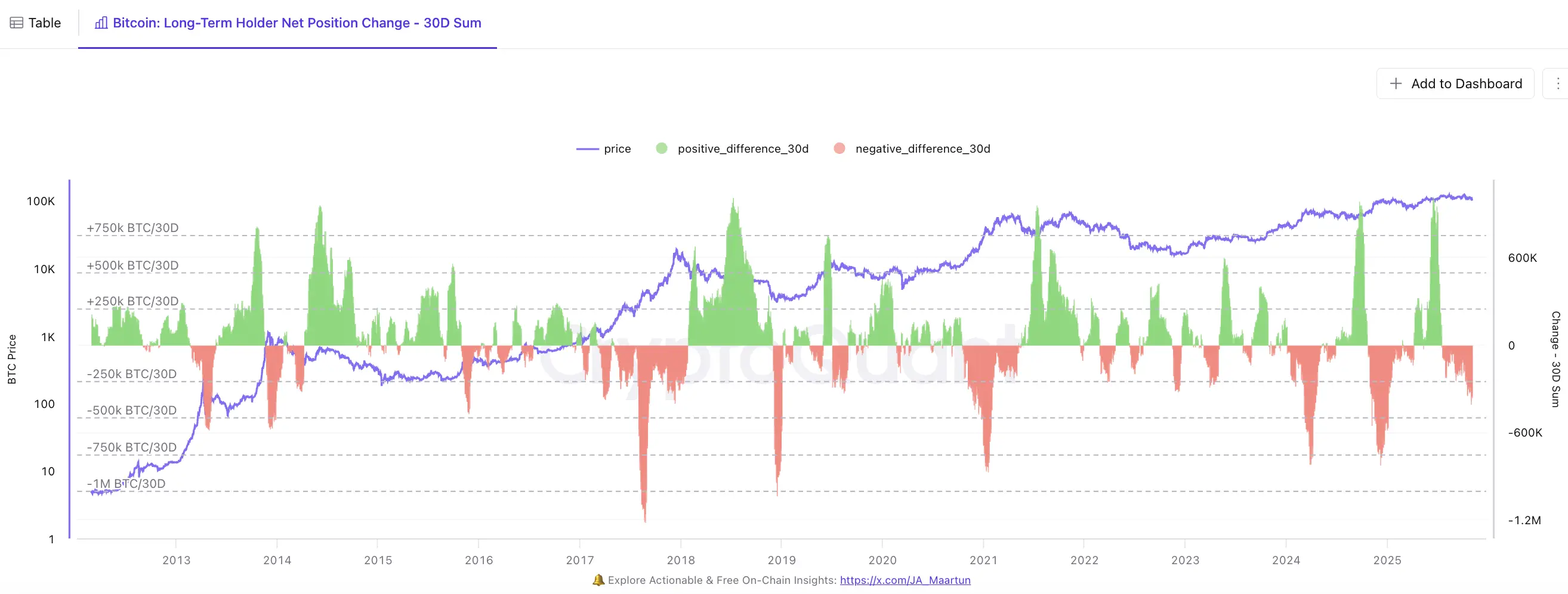 长期持有者(LTH)的大量抛售行为,也是当前比特币市场面临压力的一个重要因素。长期持有者通常被视为市场中的“聪明资金”,他们通常在市场上涨时积累资产,在市场价格达到一定高点时选择锁定利润。根据链上数据,近期大量的 LTH 已开始逐步减少比特币的持仓量,从11月4日前的过去一个月,LTH累计卖出超过40万枚BTC,占当前流通量(1994万枚)约2%套现超过400亿美金。特别是比特币价格在高位震荡时,长期持有者的抛售行为通常会加剧市场的下行压力。这种资金的撤离信号表明,投资者的风险偏好正在降低,他们可能已经开始担心比特币已接近周期顶点。