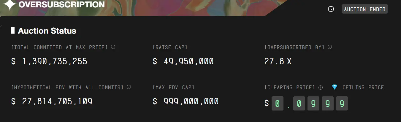 MegaETH公募阶段已结束,整体热度显著超出预期,最终认购规模约13.9亿美元,超额认购27.8倍。此次发行在 Echo 的 Sonar 平台完成,代币总供应100 亿枚中有 5 亿枚以 USDT 公开拍卖,占比 5%,参与门槛设定为最低 2,650 美元、最高 186,282 美元。本次发行采用英式竞拍模式,即价格从预设的低价起拍,随着竞拍的不断上升,直到达成市场统一成交价之后全体中标者按照同一价格结算。在本轮中,起拍价为 0.0001 美元/枚(对应 FDV 100 万美元),且设置最高封顶价 0.0999 美元/枚(对应 FDV 9.99 亿美元)。参与者以愿意支付的最高价格提交申购,但最终价格并非按个人出价,而是由市场有效需求共同决定最终的成交价,所有成功分配者均以该统一价格获得代币(本轮中MegaETH对出价低于 9.99 亿美元 FDV的参与者进行了退款)。因此,用户的最终成本取决于最终的成交价,而非个人申购的价格上限,其机制更接近于统一价格拍卖而非连续竞价。