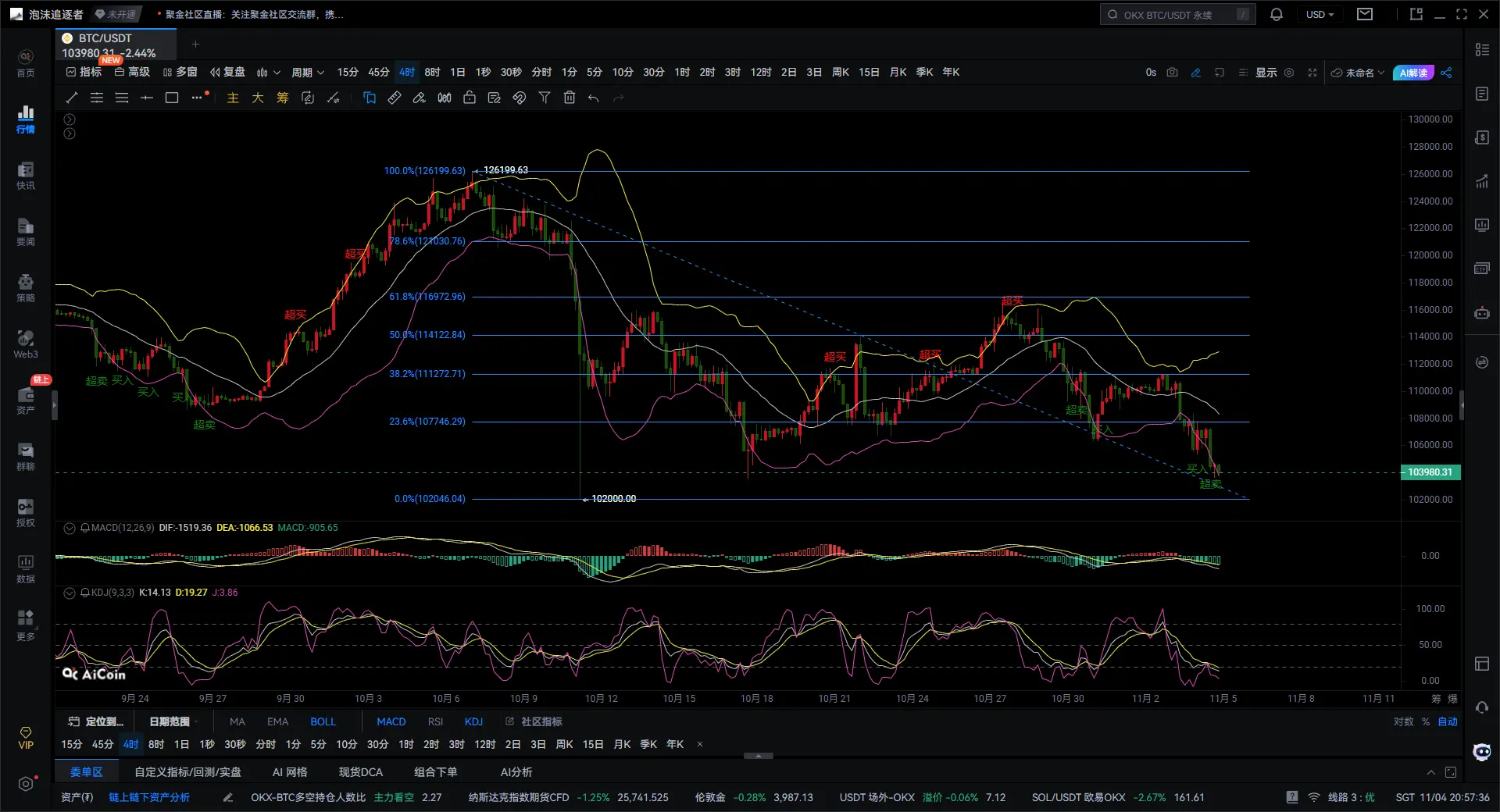 斐波那契回调线从高点126199到低点102046,关键位置:23.6%回调位107746为第一压力位,38.2%的111272是关键分界区,50%的114122是中期压制位,61.8%的116972则为强阻力区。当前价格在0%到23.6%区间波动,如果能守住102000支撑并形成底部形态如W底,可能向上修复至107700-111000区域;反之如果失守102000,下一目标将可能指向98000到95000区间。