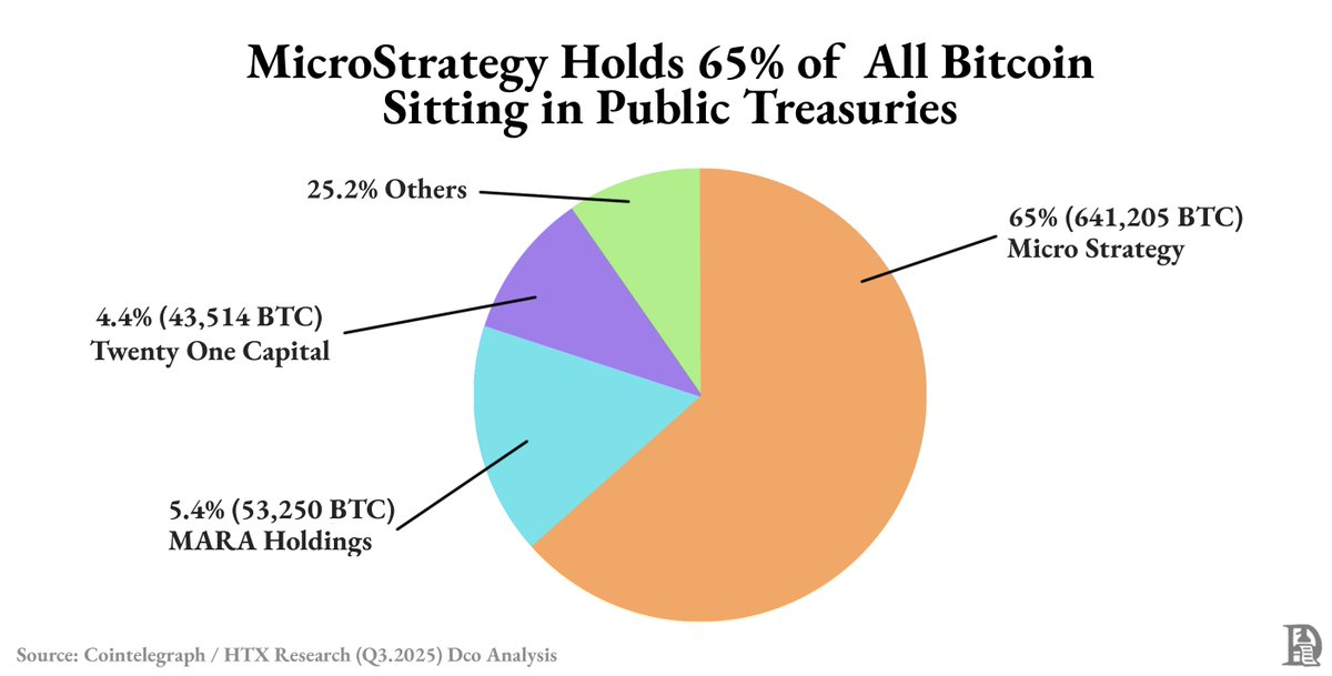 Strategy单独持有了所有公开储备比特币的近63%。剩下的大部分则由排名前六的公司掌握。