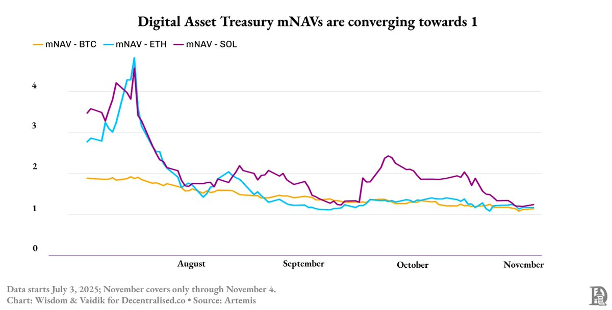 到2025年中,这个循环被打破:比特币资产储备公司的溢价从1.9倍降至1.3倍,而以太坊和SOL(Solana)的资产储备溢价在两个月内从4.8倍骤降至约1.3倍。