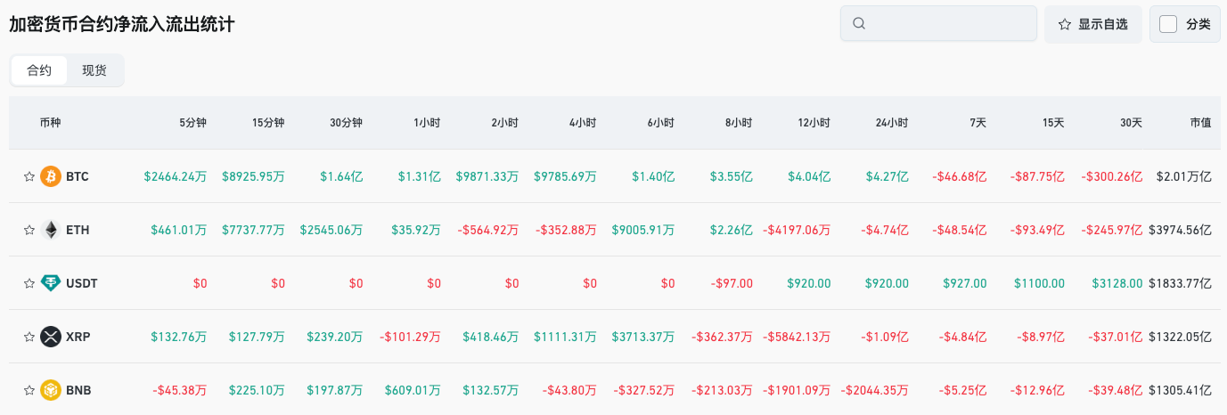 5、过往 24 小时内,BTC、ETH、USDT、XRP、BNB等合约交易净流出领先,建议持续关注头部币种交易动态,捕捉潜在交易机会;