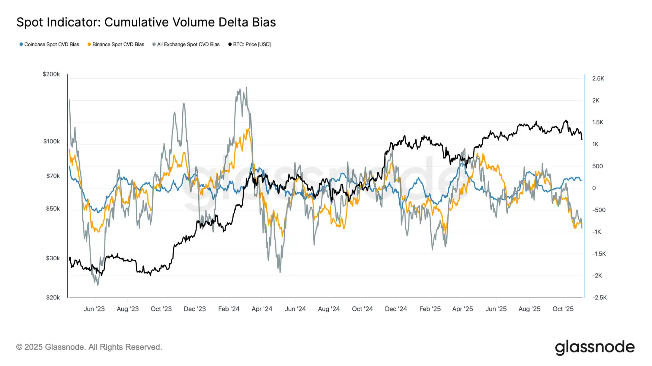 · 美国现货比特币 ETF 出现持续资金流出(每日流出 1.5 亿 - 7 亿美元),主要交易所的现货累计成交量差值(CVD)显示卖压持续,自主交易需求减弱。