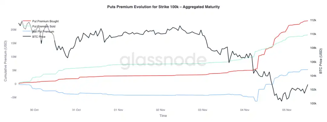 · 10 万美元行权价的看跌期权需求旺盛、溢价走高,显示交易者仍在对冲风险,而非逢低买入。短期隐含波动率对价格波动仍敏感,但在 10 月飙升后已趋于稳定。