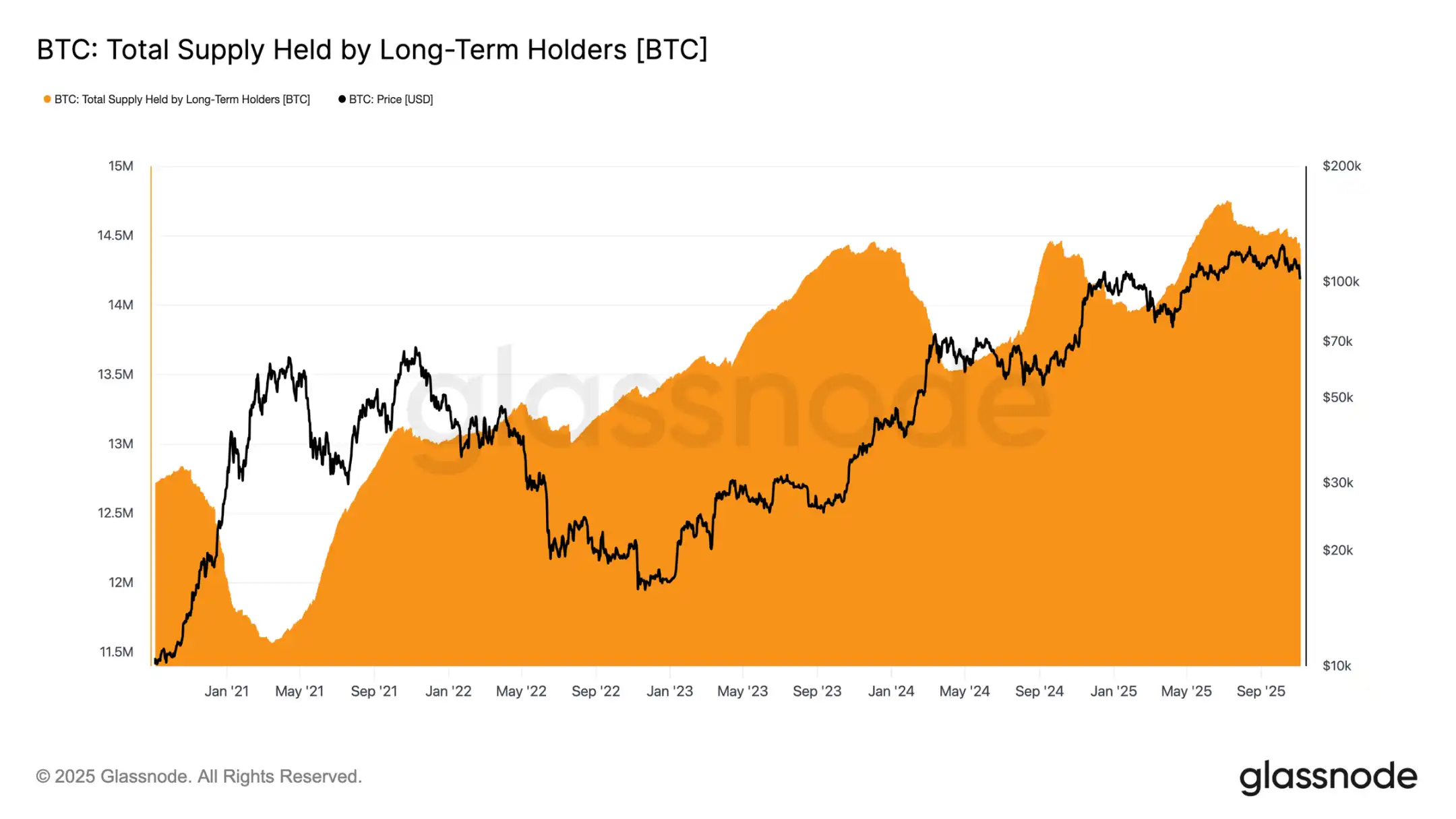 在此期间,长期持有者的比特币持有量减少了约 30 万枚(从 1470 万枚降至 1440 万枚)。与本轮周期早期的出售浪潮不同:当时长期持有者在大幅上涨期间「逢涨抛售」,而此次他们选择「逢弱抛售」,即在价格盘整且持续走低时减持。这一行为转变表明,经验丰富的投资者已显露出更深的疲惫感,信心有所下降。
