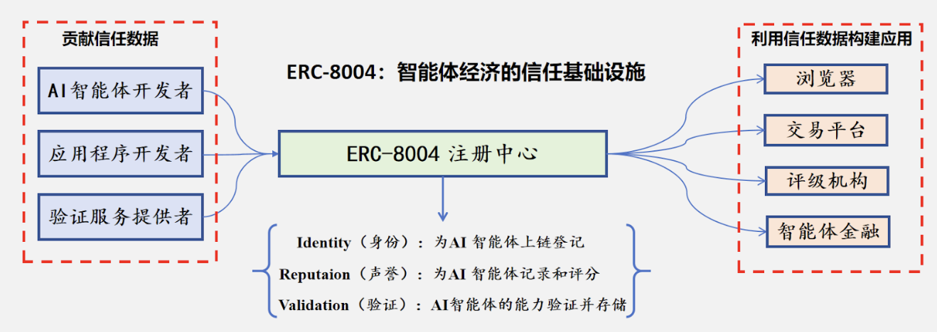 这些信息共同汇入 ERC-8004 注册中心,该中心汇聚了协议的三大核心功能: