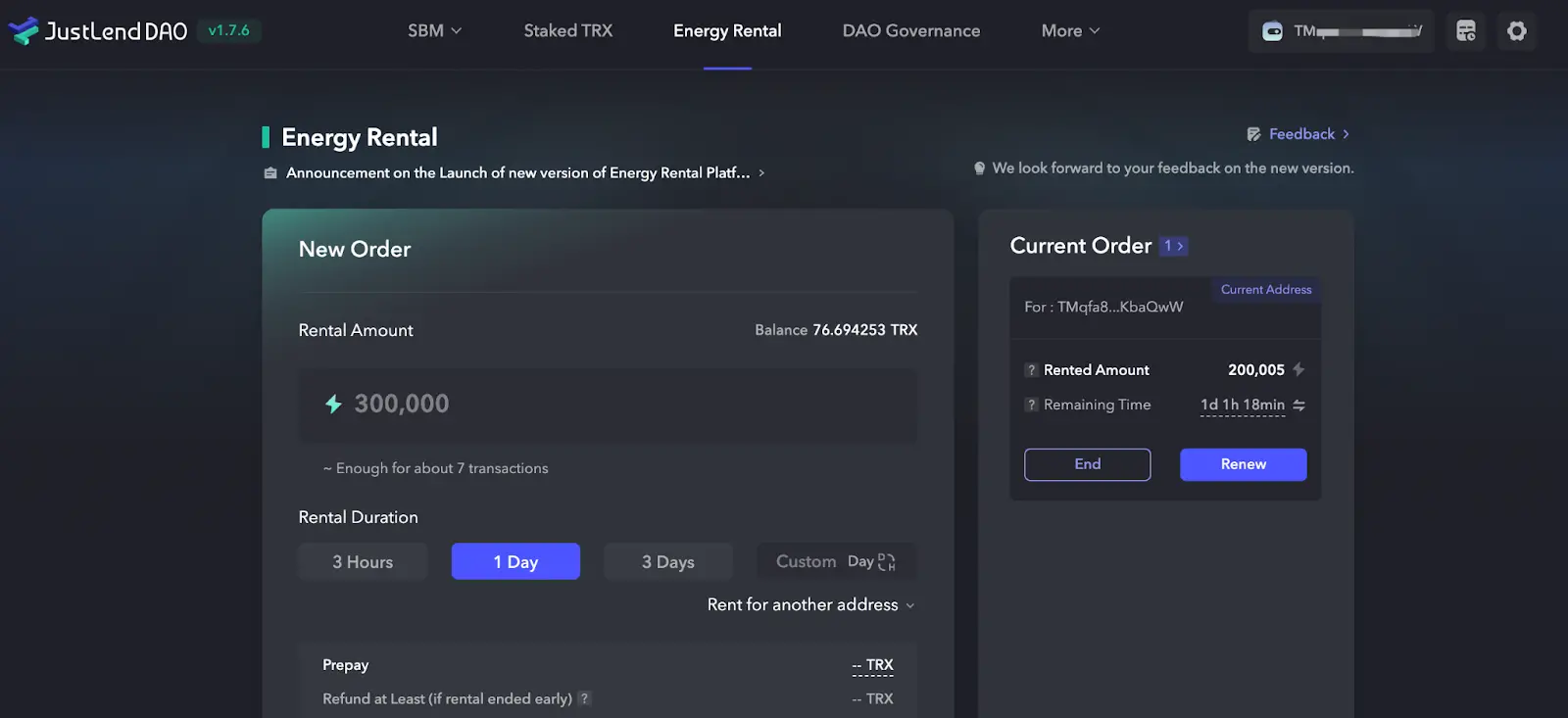 在波场TRON网络中,进行任何链上交互均需消耗“能量”(Energy),这是执行智能合约和转账等操作的基础资源。关于波场TRON链上的交易费,如果用户交易次数较多,可以在Justlend DAO上的能量租赁中心(Energy Rental)租赁能量。获得能量后,每笔支付的链上交易费用可大幅降低,节省不少成本。这一模式不仅灵活高效,精准契合短期高频用户的交互需求,更能显著降低能量获取成本,帮助用户“随租随省”,极大提升资金使用效率。