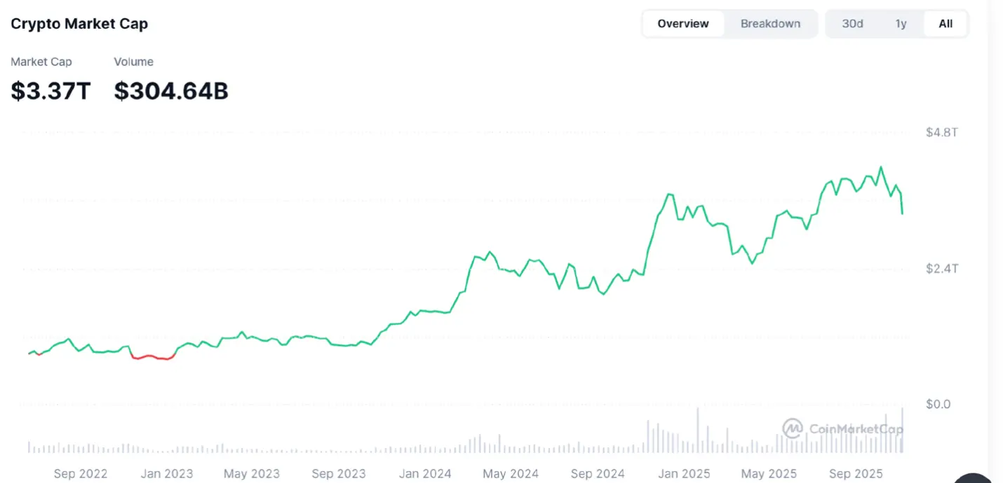 2025年11月,全球加密市场处在一个结构性转折点:不是新牛的全面起势,也非下行深渊的被动防守,而是“脱虚向实、从叙事回归技术、从纯投机转向结构性参与”的关键窗口。推动这一转折的根因,不在单一价格或单一政策,而在宏观范式的整体切换,过去两年,后疫情时代以财政支出扩表为主导的总需求管理逐步退潮,货币政策的中性偏紧周期显著见顶,政府对流动性的直接牵引力减弱,私人部门重新拿回资本分配的主导权,新科技叙事和生产函数的重估开始影响资产定价的底层逻辑。政策的重心,从“补贴与转移支付拉动名义需求”转向“效率与技术进步带动潜在增速”。在这个过渡中,市场愿意为“具可验证现金流与技术扩张曲线”的资产支付溢价,而对“高杠杆、强顺周期、单靠估值扩张”的标的显得更为审慎。