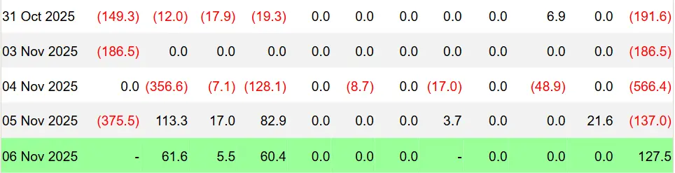 本周期内ETF资金大幅流出,尤其是4日及5日流出规模急增,反映出机构在市场不确定性增强期开始撤离或观望。11月6日虽有少量回流,但幅度远低于前两日流出规模,整体仍呈流出格局。