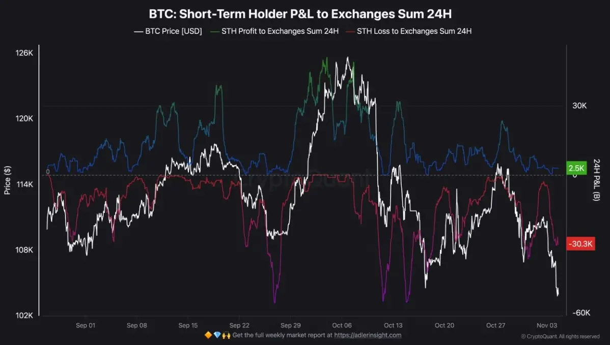 CryptoQuant 报告指出,短期持有者的亏损抛售正加剧市场下行压力。仅今日,就有约 30,300 枚比特币陷入亏损区间被转入交易所,显示出近期买家的“投降式”卖压明显上升。