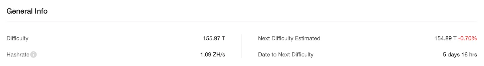 截至11月7日,全网算力达到1.09ZH/s,挖矿难度为155.97 T。预计下一次难度调整将在11月12日 进行,预估下调0.70%,调整后难度约为154.89 T。
