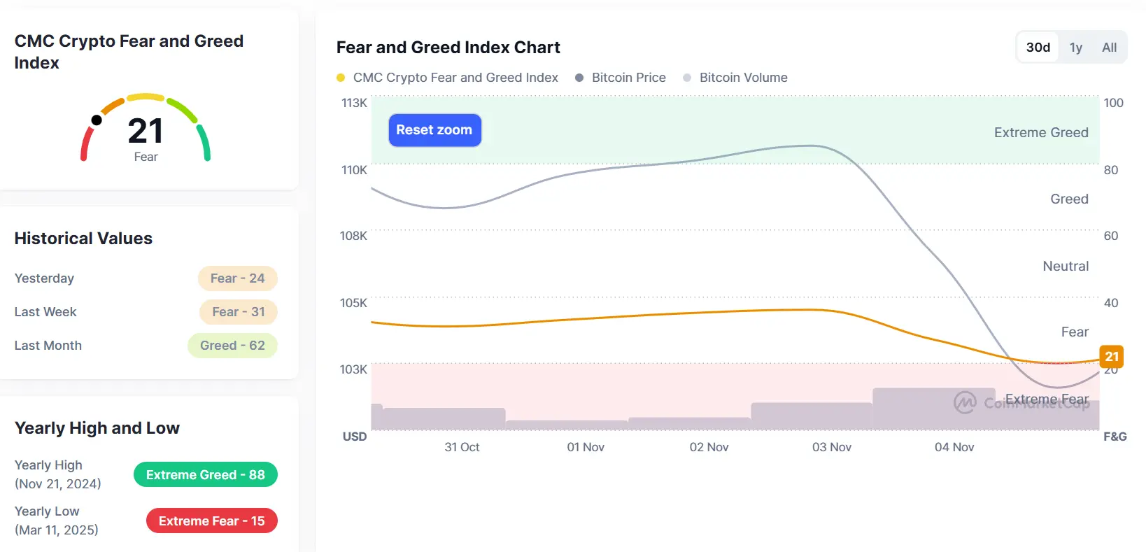 截至 11月7日,本周期末恐惧与贪婪指数(Fear & Greed Index)报21点,处于“极度恐惧”区间。图片数据显示指数持续走低。