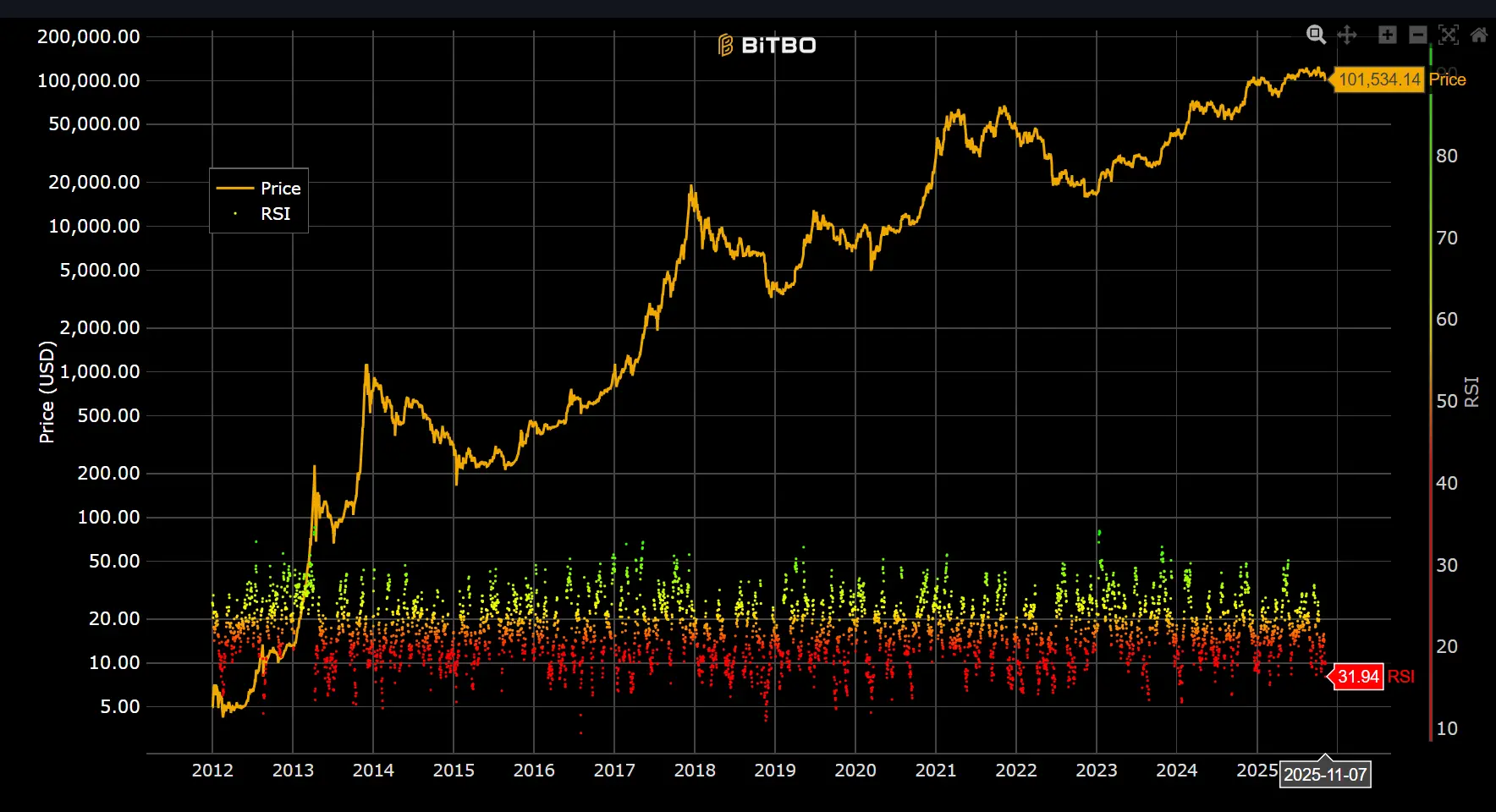 根据最新数据,截至11月7日, RSI 约为 31.94,跌至偏弱水平。