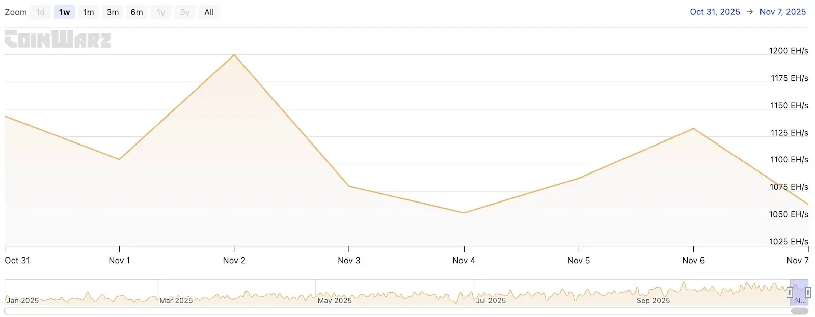 过去七天,比特币网络哈希率整体较为平稳,本周哈希率维持在1055.21 EH/s至1200.10 EH/s区间,处于相对高位。