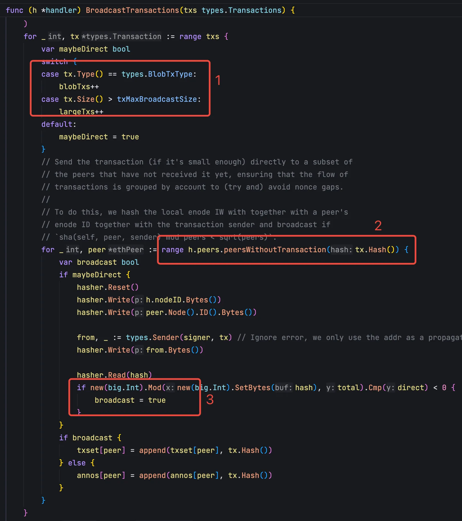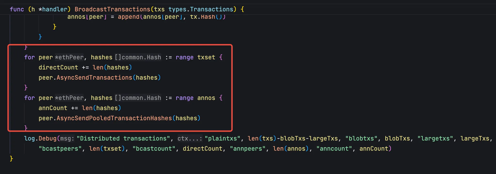 依照上面的原则对交易分类完成,可以直接传播的交易就直接发送,blob 交易或者大交易则只广播 hash,等到需要用到这笔交易的时候再来获取。