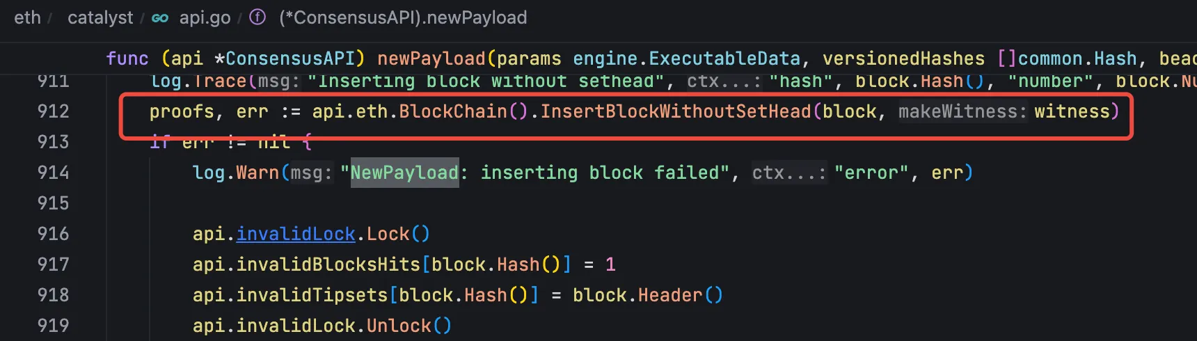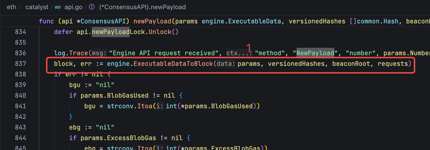 共识层在同步到区块之后,使用 engine API 将同步到的最新区块传输到执行层。使用的是 engine_NewPayload 系列方法。这系列的方法最后都会调用 newPayload 方法,在这个方法中将共识层的 payload 组装成一个 block: