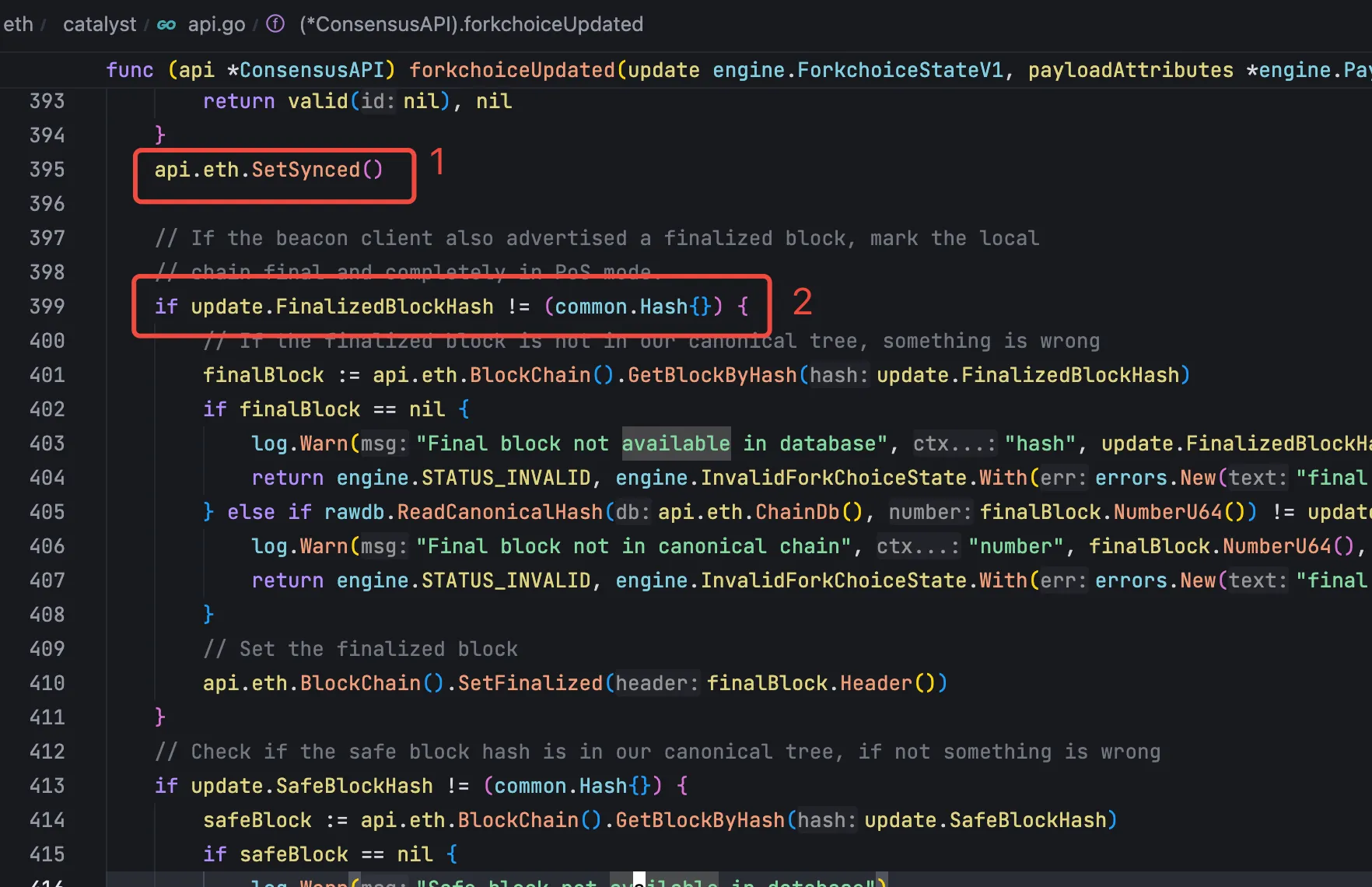 在 ForkchoiceUpdated 方法中会对执行层当前的状态做校验,如果当前执行层正在同步区块、或者获得最终性的区块不符合预期,那么该方法都会向共识层直接返回错误信息,构造区块失败: