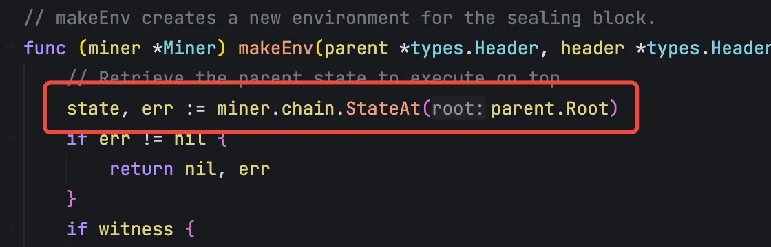 在打包交易的过程中,同时也会将交易在 EVM 中执行,得到区块交易完成之后状态的变化,同样还是在 generateWork 函数中,准备好当前区块执行的环境变量,主要是获取最新区块和最新状态数据库:
