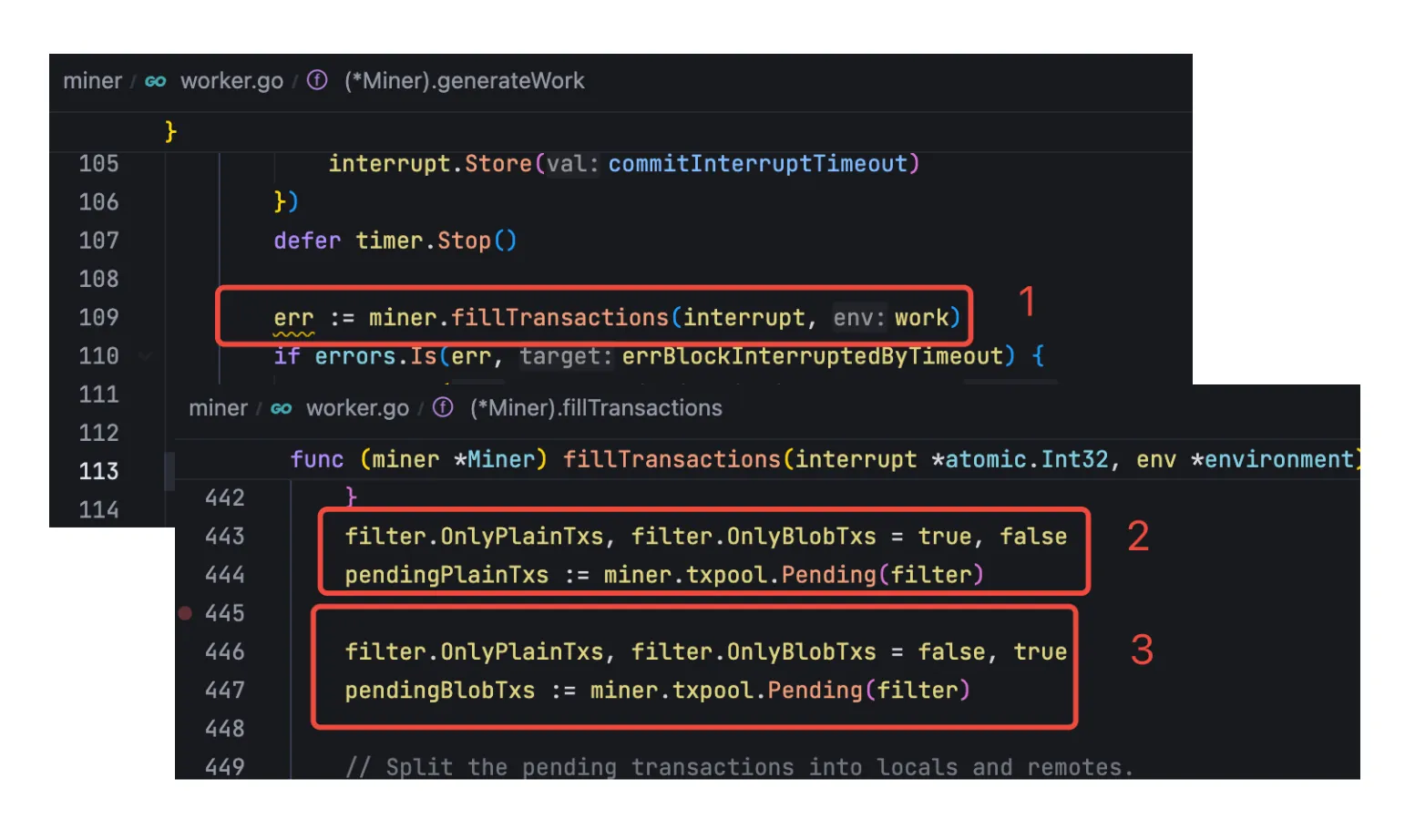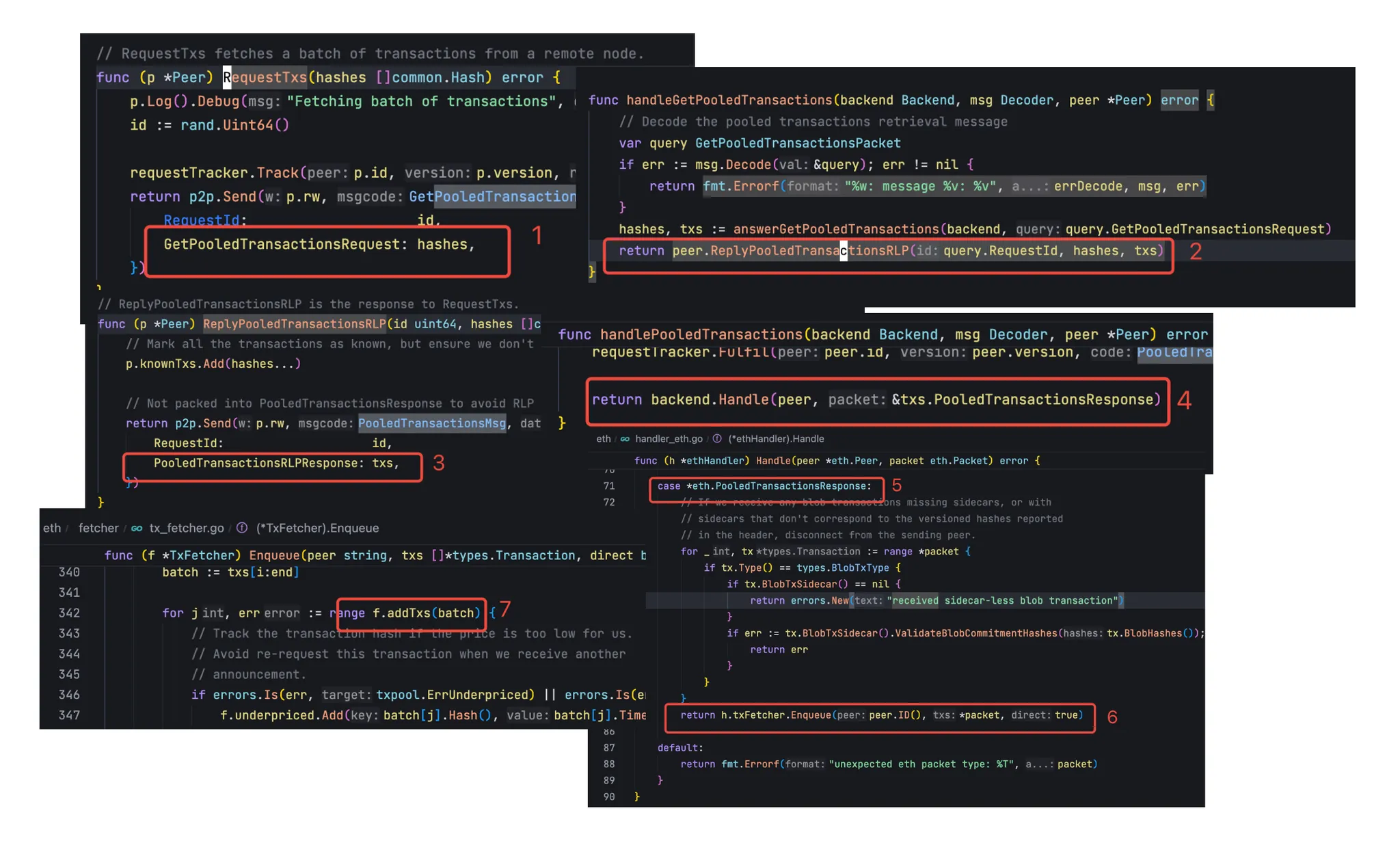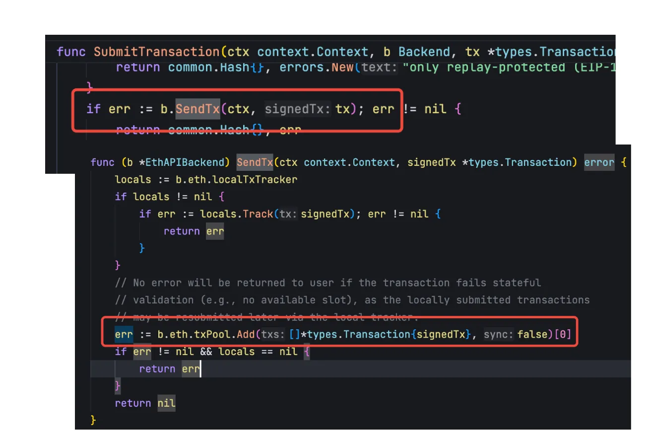 // eth/backend.go New 函数if eth.handler, err = newHandler(&handlerConfig{NodeID: eth.p2pServer.Self().ID(),Database: chainDb,Chain: eth.blockchain,TxPool: eth.txPool,Network: networkID,Sync: config.SyncMode,BloomCache: uint64(cacheLimit),EventMux: eth.eventMux,RequiredBlocks: config.RequiredBlocks,}); err != nil {return nil, err}// eth/handler.go newHandler 函数,注册获取新交易的过程fetchTx := func(peer string, hashes []common.Hash) error {p := h.peers.peer(peer)if p == nil {return errors.New("unknown peer")}return p.RequestTxs(hashes) // 去其他节点请求交易}addTxs := func(txs []*types.Transaction) []error {return h.txpool.Add(txs, false) // 将交易加入交易池}h.txFetcher = fetcher.NewTxFetcher(h.txpool.Has, addTxs, fetchTx, h.removePeer)// eth/handler_eth.go Handle 方法,在接收到新的交易之后,会添加到交易池中for _, tx := range *packet {if tx.Type() == types.BlobTxType {return errors.New("disallowed broadcast blob transaction")}}return h.txFetcher.Enqueue(peer.ID(), *packet, false)// eth/fetcher/tx_fetcher.go 的 Handle 方法会调用上面注册的 addTxs 来将讲义添加到交易池for j, err := range f.addTxs(batch) {//....}