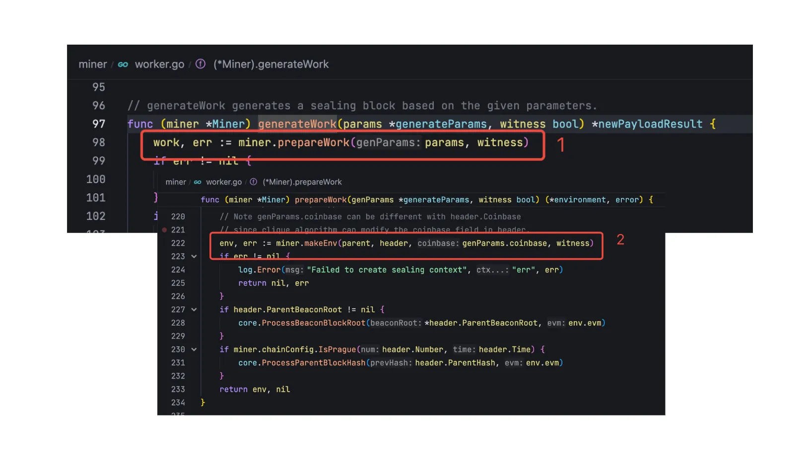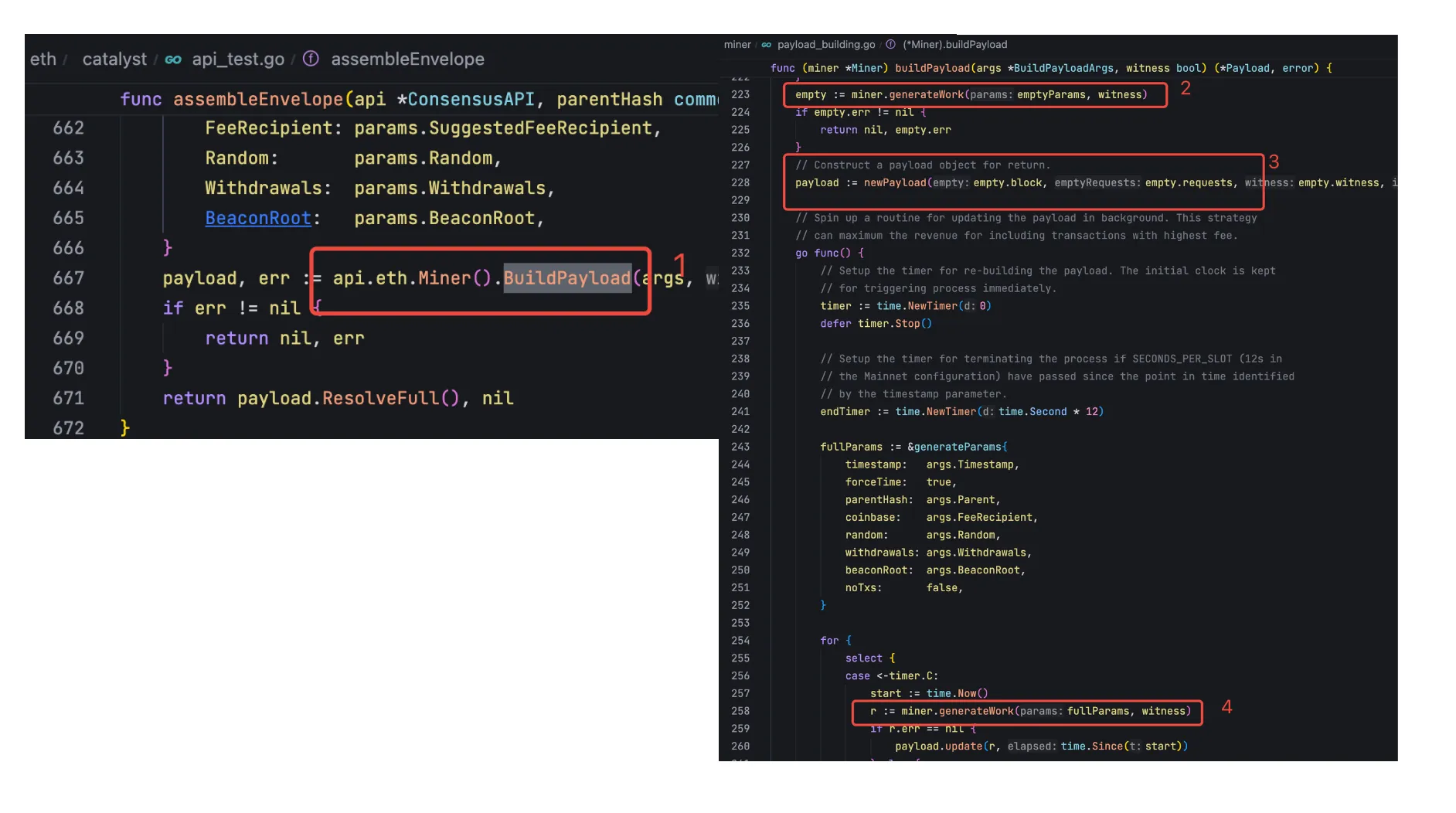 在对执行层的信息校验完成之后,就会调用 miner/miner.go 中的 BuildPayload 方法来构造区块。构造区块的具体操作都在 miner/payload_building.go 中的 generateWork 方法中完成,但这里需要注意,在调用这个方法之后,就会先产生了一个空的 payload,并把这个 payloadID 返回给共识层。同时会启动一个 goroutine 真正去完成区块的打包流程,这个 goroutine 会持续去交易池中找价值更高的交易,每次重新打包交易之后,都会更新 payload。
