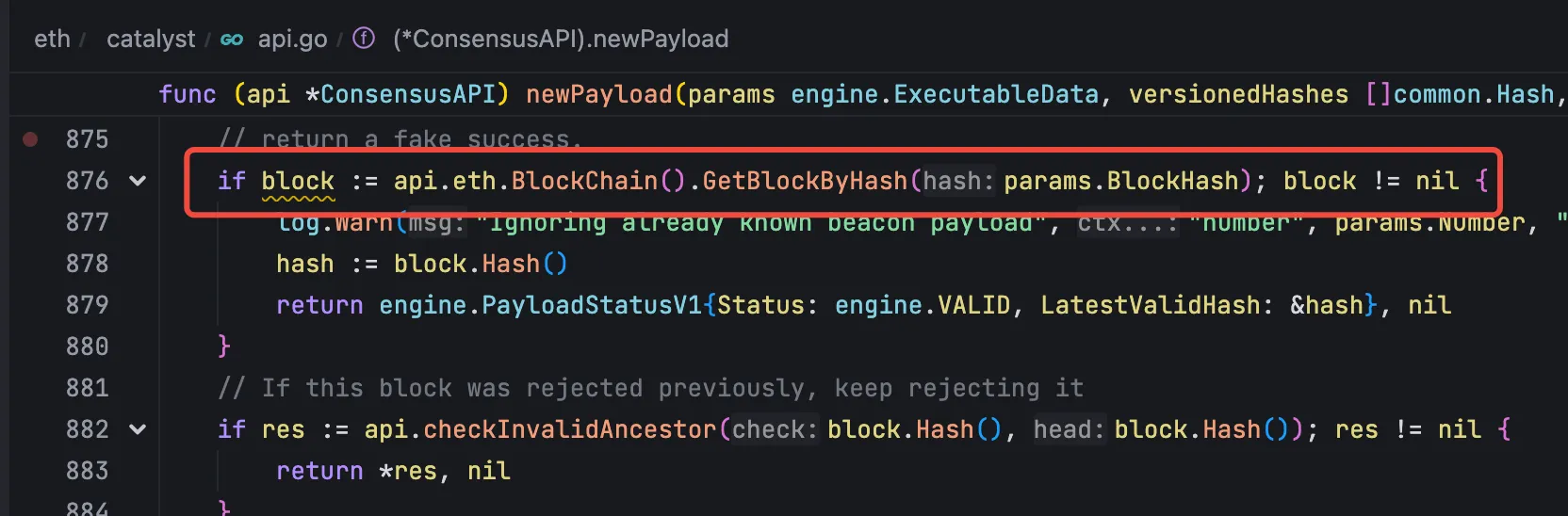然后检查这个区块是否已经存在了,如果存在了,那么就直接返回取消有效的状态: