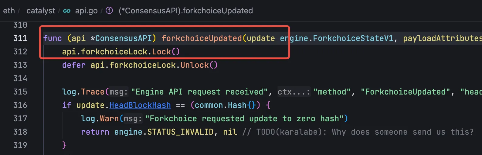 无论调用的是 ForkchoiceUpdated 的哪个版本,最终都是调用 forkchoiceUpdated 方法来构造区块: