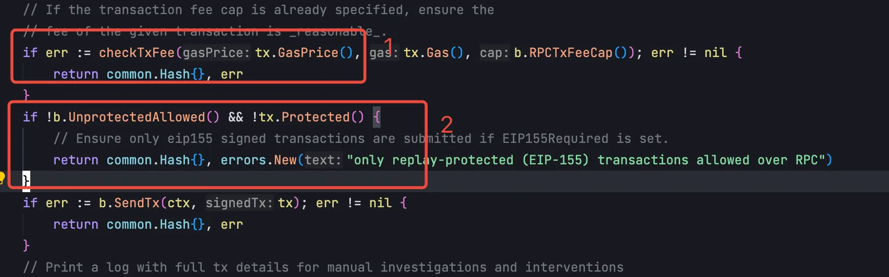 在 这个函数中,会对交易做两个基本的检查,一个是检查 gas fee 是否合理,另一个是检查是交易是否满足 EIP-155 的规范,EIP-155 通过在交易签名中引入 chainID 参数,解决了跨链交易重放问题。该检查确保当节点配置开启 EIP155Required 时,所有向交易池提交的交易都必须符合这个标准。