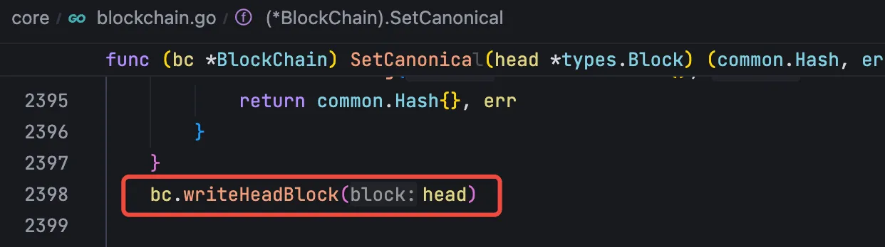 还有一种情况会触发区块头的设置,那就时区块发生重组,区块重组会执行 core/blockchain.go 的 reorg 方法,在这个方法中同样会设置当前最新确定的区块头。