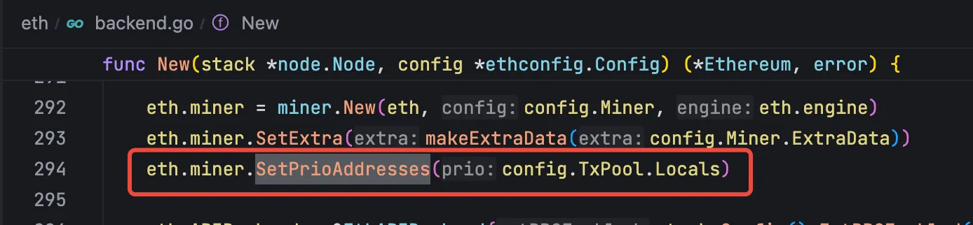 在eth/backend.go的 New 方法中启动时会加载交易池的配置,其中有一个 Locals 的配置,这个配置中的地址会被视为本地地址,这些本地地址提交的交易会被优先处理。
