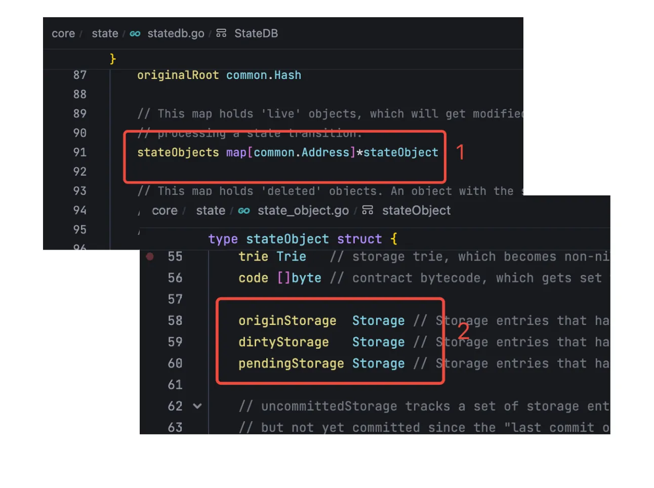 在这里形成了一个 StateDB → stateObjects→ stateAcount 的结构,分别代表完整的状态数据库、账号对象集合以及单个账户对象。其中 StateObject 中结构中,dirtyStorage 表示当前交易执行后已改变的状态,pendingStorage 表示当前区块执行之后已改变的状态,originStorage 表示原始的状态,所以这三个状态从新到旧是 dirtyStorage → pendingStorage → originStorage,这里关于存储的详细解析可以查看之前关于存储的详细解析: