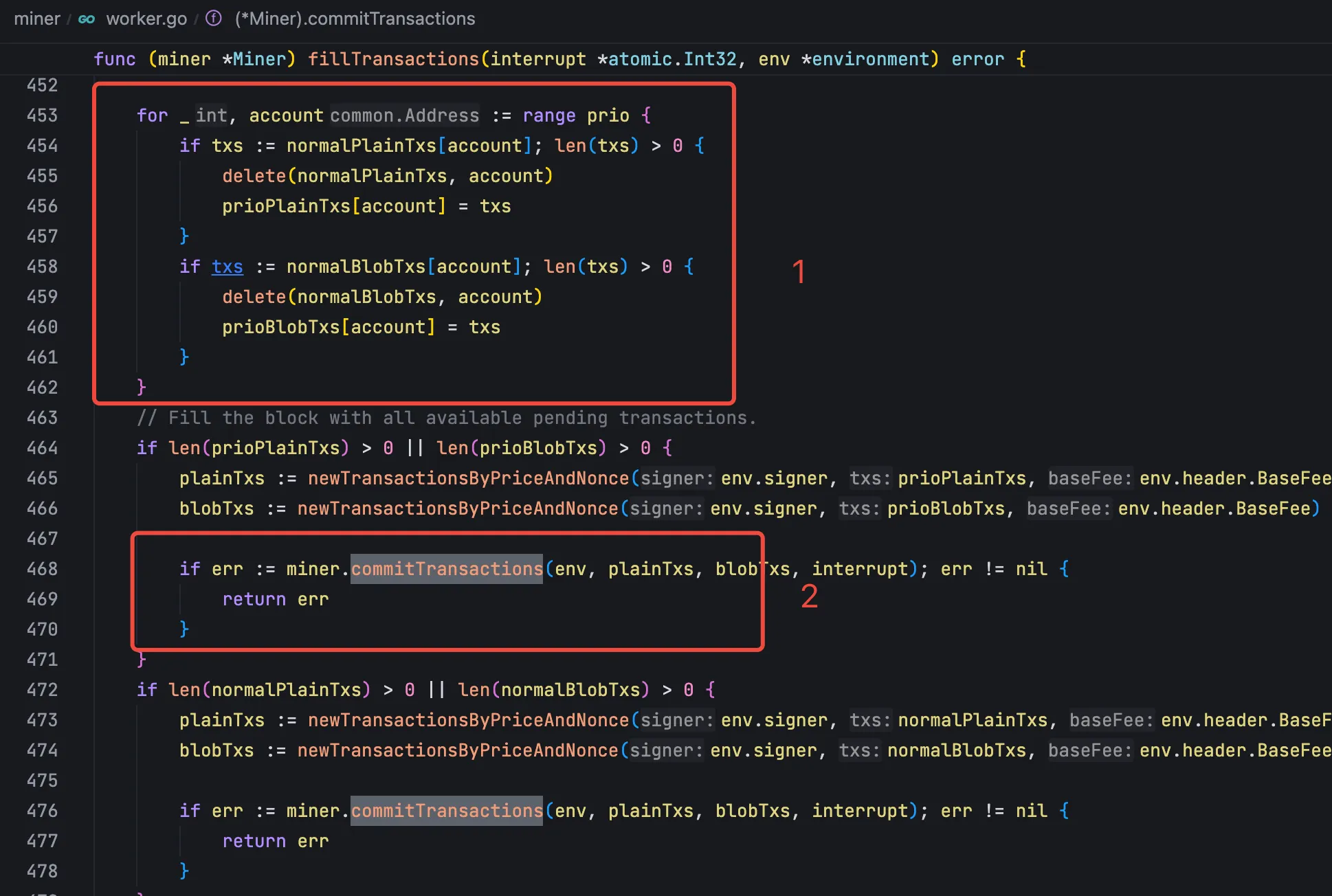 在获取到当前的环境变量之后,就可以执行交易了,首先会获取全部待打包的交易,并把其中的本地交易挑选出来,区分成本地交易和正常交易,然后会对本地交易和正常交易分别按照手续费从高到低打包交易。交易具体的执行都在miner/worker.go中 commitTransactions 方法中进行: