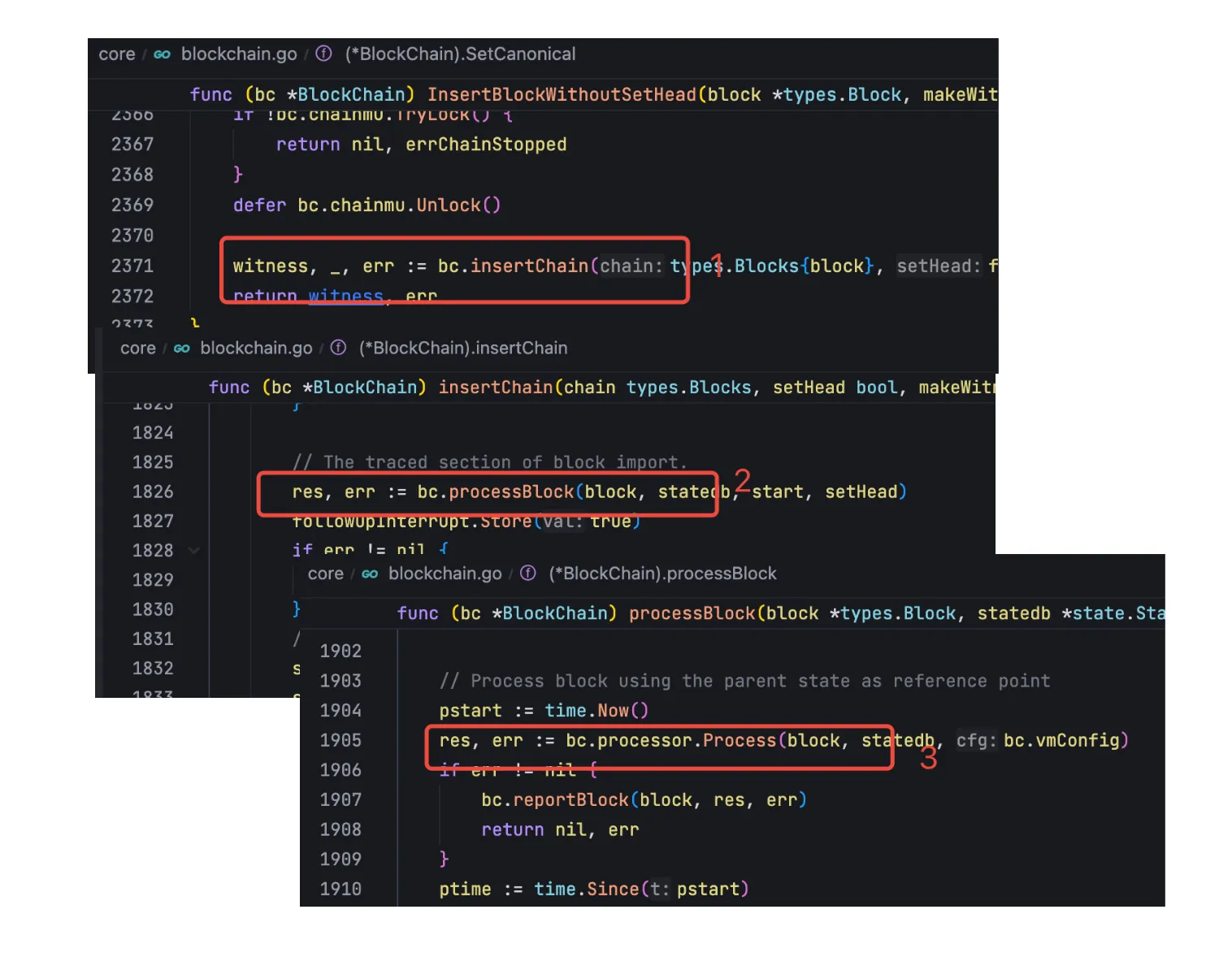 回到区块的执行过程,在 core/blockchain.go 中的 InsertBlockWithoutSetHead 方法会调用 insertChain 方法,在这个方法中,会做一系列条件的检查,检查完成之后,就会开始处理区块:
