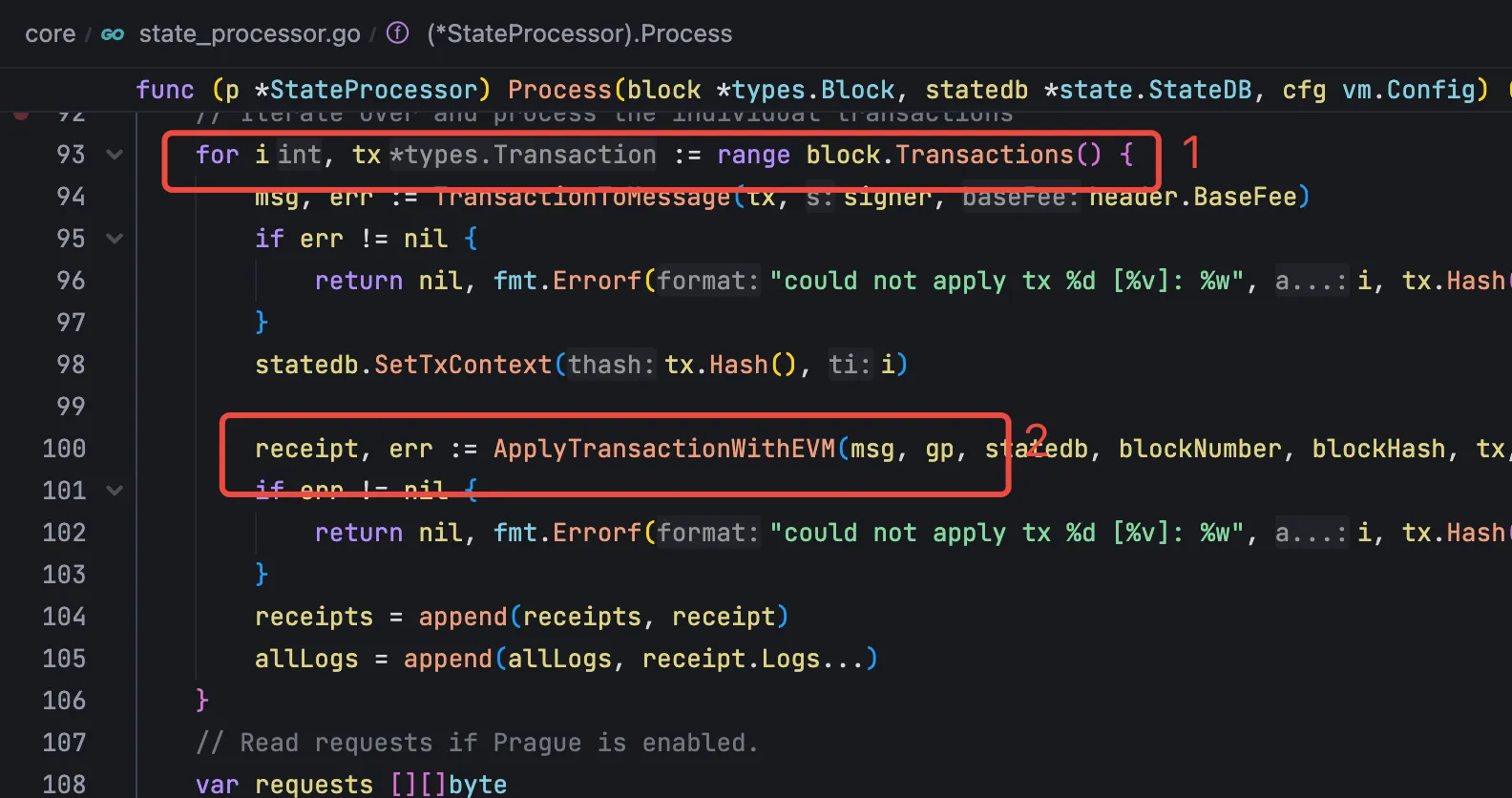 在具体的 Process 里面,处理逻辑就很清晰了,和之前打包交易的流程类似,不断在 evm 中执行交易,然后修改状态数据库,与打包不同的地方在于,这里只是将新区块中的交易重放一遍,而不需要去交易池中获取。