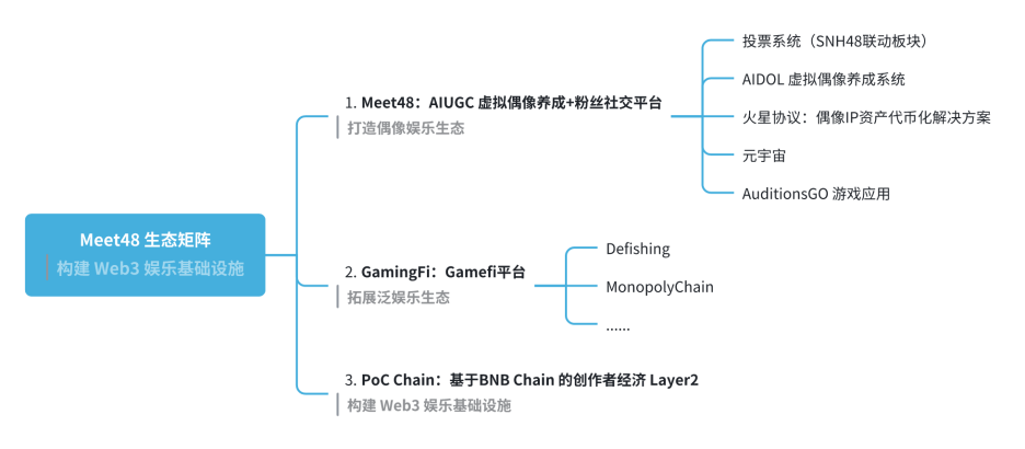 围绕这一愿景,MEET Labs 已孵化轻量级游戏平台 GamingFi,初步形成跨内容的生态矩阵。而这只是开始。MEET48 计划在BSC生态中发展兼容EVM的Layer2 PoC侧链,形成用户、资产、技术、应用的闭环: