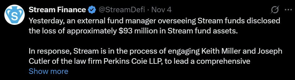 到目前为止,最具毁灭性的是 Stream Finance 的损失。