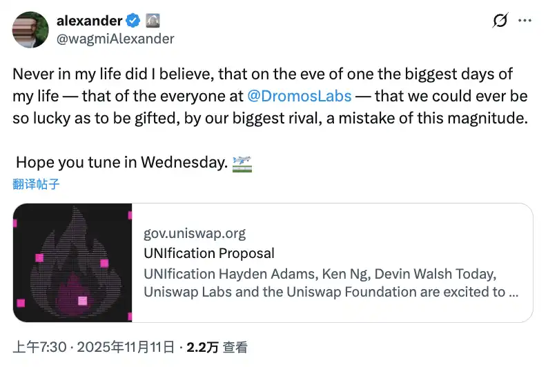 Uniswap 的提案后,Aerodrome 开发团队 Dromos Labs 的首席执行官 Alexander 在 X 上讽刺:「我从未想到,在 Dromos Labs 迎来最重要日子的前一天,我们最大的竞争对手会送来的如此重大的失误」