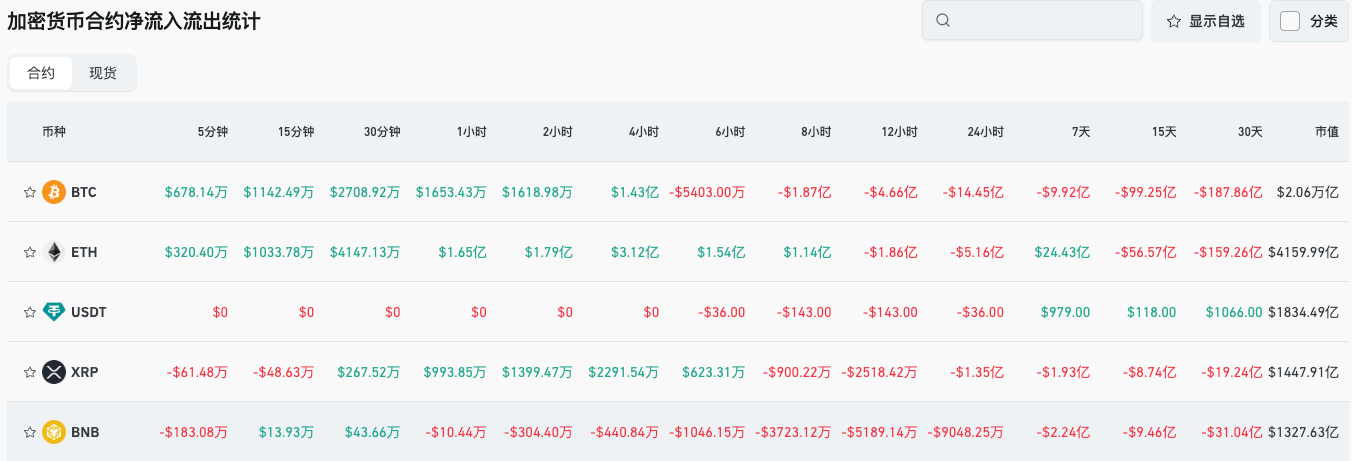 5、过往24小时内,BTC、ETH、USDT、XRP、BNB等合约交易净流出领先,或存在交易机会;