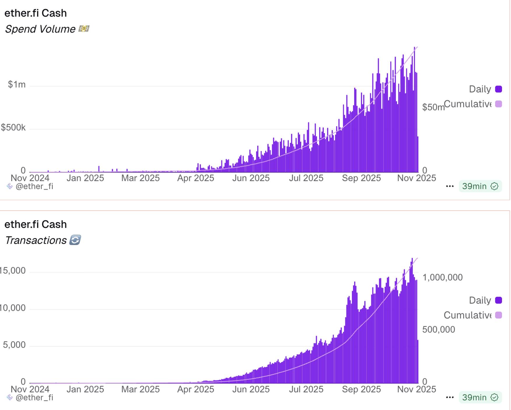 自 2025 年中期上线以来,Ether.fi Cash 已成长为活跃度最高的加密卡产品之一。截止 11 月 7 日,其累计消费额接近 1 亿美元,交易笔数突破 110 万次。UserSafe 账户余额已超过1.87亿美元,累计返现超 400 万美元,活跃卡数量接近 4 万张,展现出强劲的市场增长势头。