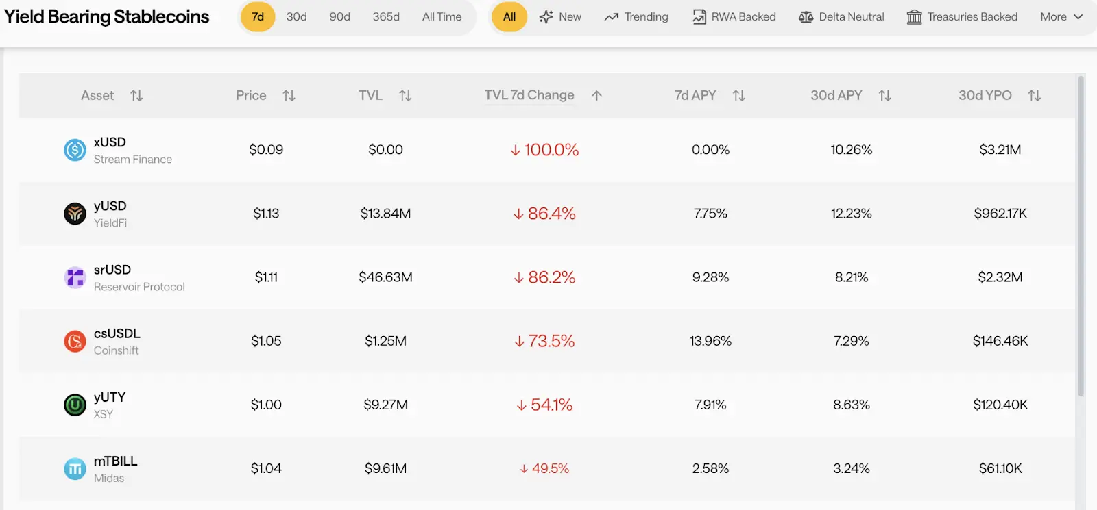 Stream Finance 事件引发的连锁清算迅速演变为行业资金撤离潮。11 月第一周 DeFi 总锁仓量在短时间内从约 1,500 亿美元降至 1,300 亿美元,稳定币总市值同期缩水约 25 亿美元。其中,收益型稳定币板块受创最为严重,xUSD 的TVL几乎归零,而 yUSD、srUSD、csUSDL 等同类资产的锁仓规模也在一周内下跌约80%,部分流动性池的资金流出率超过 60%,市场避险情绪迅速升温。