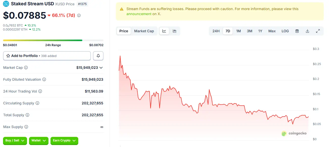 此次暴雷的直接导火索是外部资产管理失误与协议杠杆结构叠加引发的流动性危机。11 月 3 日,Stream Finance 披露外包基金经理亏损约 9,300 万美元;随后在 11 月 4 日暂停所有存取款操作。由于协议资产高度循环利用,这一链下亏损迅速削弱抵押能力,触发清算与恐慌性挤兑。短短 48 小时内,xUSD 从1美元暴跌至约 0.1 美元,流动性池几乎被抽空,多个协议因 xUSD 价值下跌而启动紧急停用与赎回程序。
