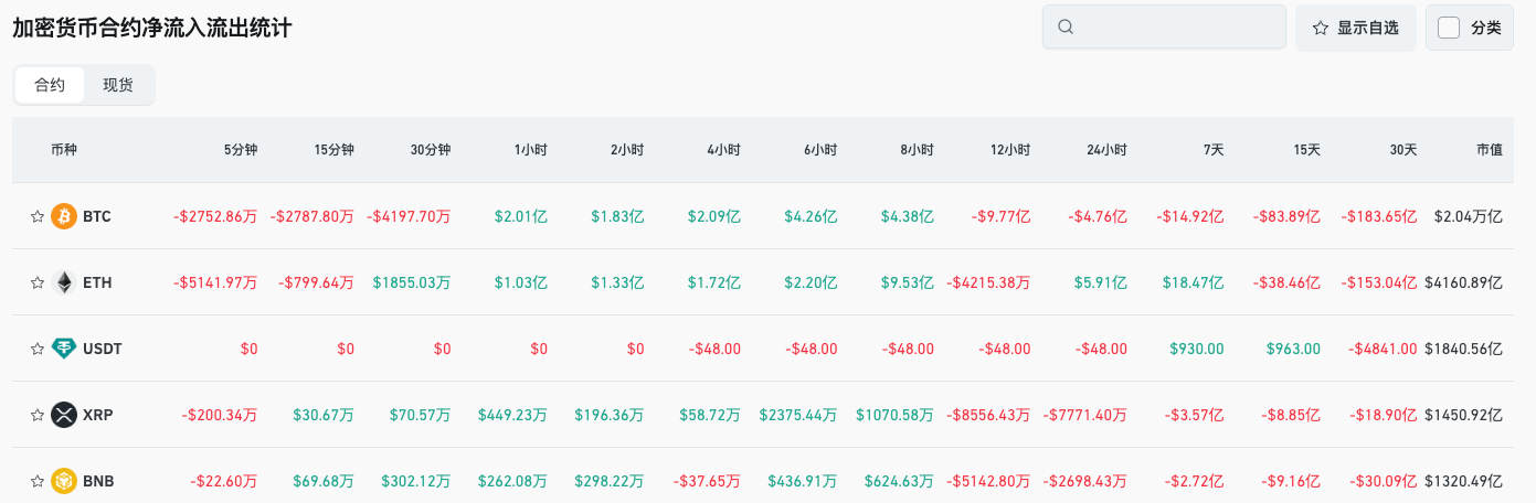 5、过往 24 小时内,BTC、ETH、USDT、XRP、BNB 等币种合约交易净流出领先,或存在交易机会;