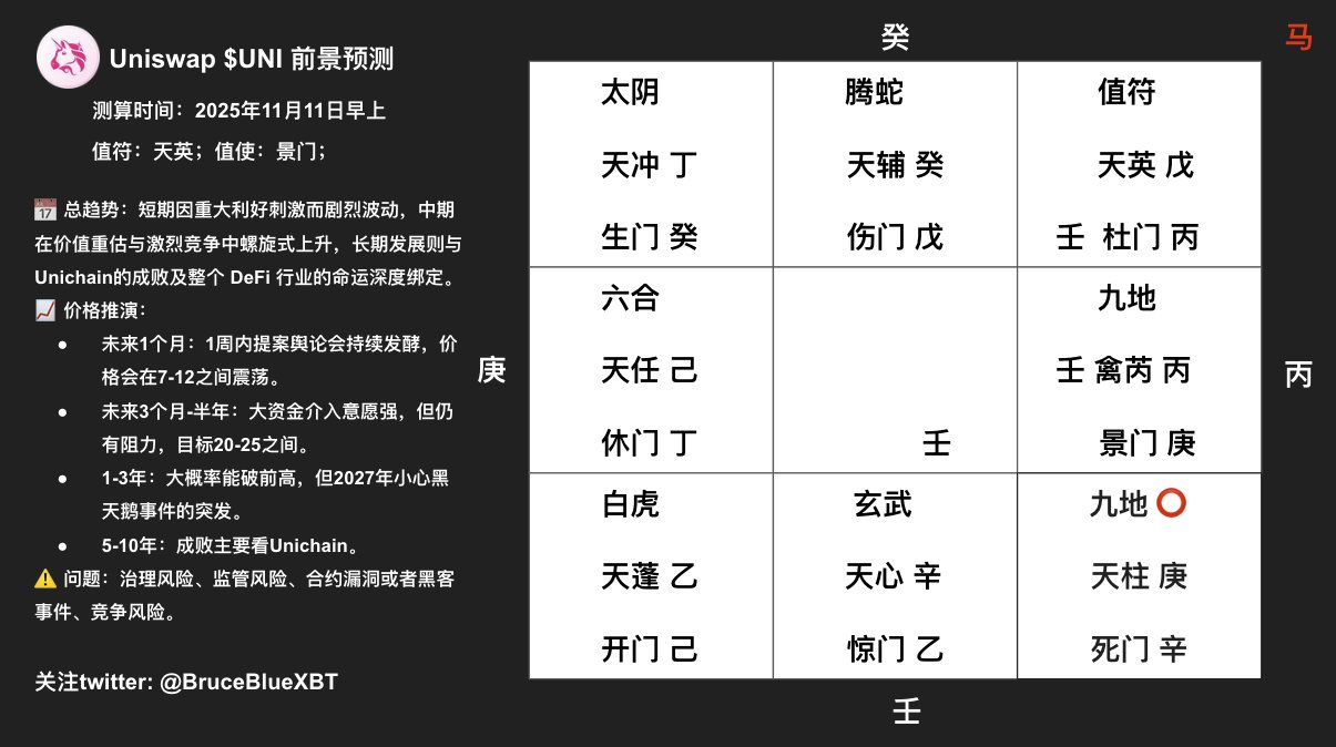 格局定位:坤宫「值符 戊丙青龙返首」,此乃王者归来、价值重估之象。费用开关的开启是引爆这一趋势的关键。 $UNI 将摆脱「无价值治理代币」的帽子,成为具有明确现金流和通缩预期的核心资产。