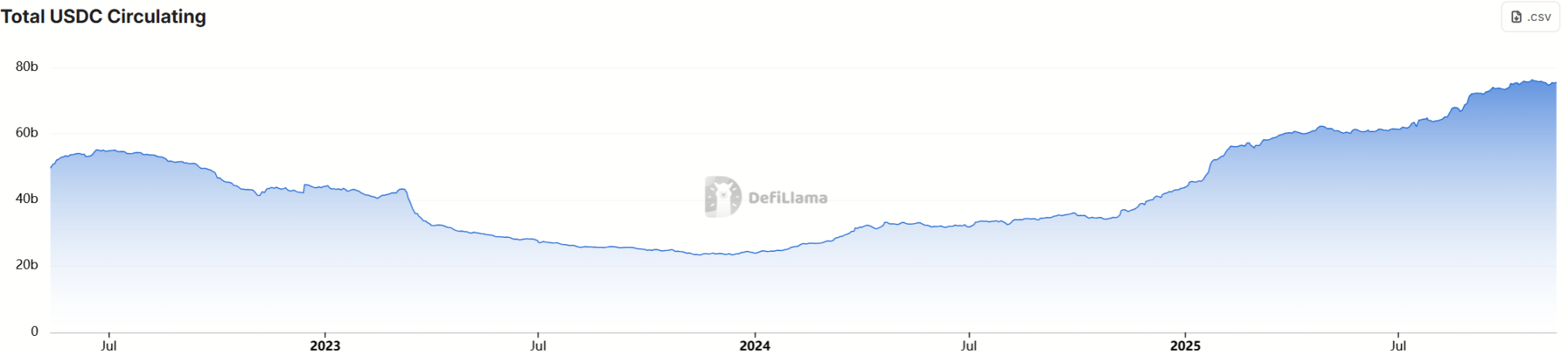 Circle Internet Group 发布的第三季度财务报告显示,公司营收同比增长 66%,达到约 7.4 亿美元,净利润大幅提升。这一强劲表现得益于 USDC 流通量的激增——截至报告期末,USDC 市值已超过 750 亿美元,位居全球第二大稳定币,仅次于 Tether 的 USDT。