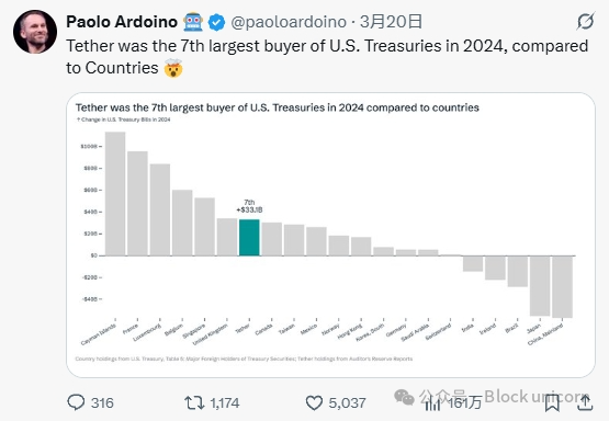 到 2024 年底,Tethe 当时已成为美国国债的第七大外国买家,在年度购买量上超过了加拿大和墨西哥等国家。