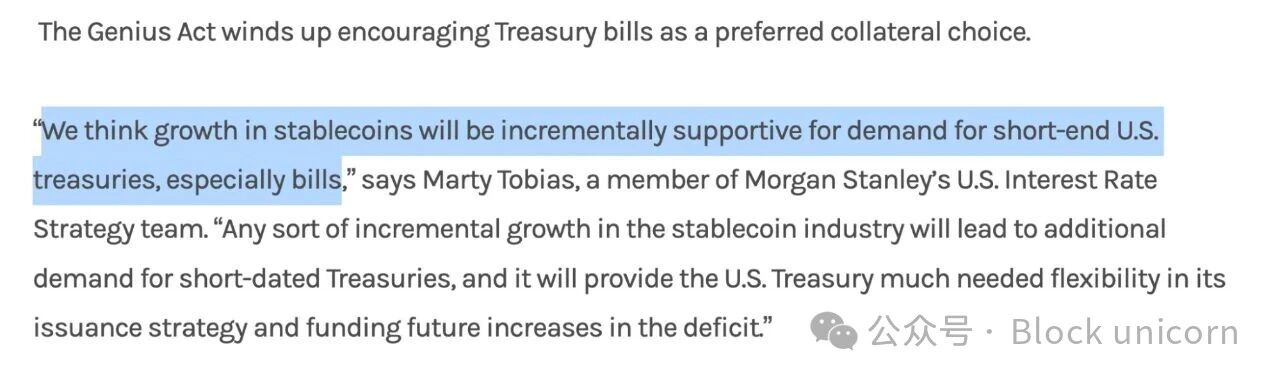 甚至摩根士丹利认为稳定币是一个增量投资机会。值得注意的是,这些代币的增长可能会提振对短期美国国债的需求,从而使财政部在弥补赤字和管理现金流方面拥有更大的灵活性。这些代币能够实现大额结算,例如银行间转账或贸易结算,几乎可以即时清算,其运作方式类似于数字现金账户。