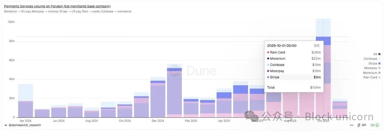 Polygon 的优势在于其多元化。全球最大的金融科技支付处理商 Stripe 目前通过 Polygon 集成,每月处理的交易额超过 800 万美元。Coinbase,MoonPay,Rain, 和 Paxos 所有这些都利用了 Polygon 的轨道进行稳定币和结算流动。