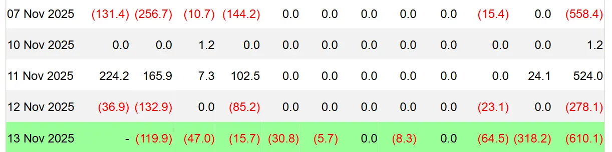 本周期内,ETF 资金流向迅速反转,由流入转为流出,体现出机构资金在当前市场环境中态度依旧谨慎。虽然11日一度回流,但随即被大规模流出所抵消,显示资金面尚未稳定。最近几周,美国现货比特币 ETF 已转向适度流出,反映出价格走势疲软和势头减弱。在年中强劲的资金流入之后,总需求已经趋于平缓,表明机构积累暂停。从历史上看,这种中性流动制度与市场整合相一致,即在下一个方向性走势之前重新建立信念。资金流入的决定性回归将标志着机构信心的恢复,而长期的资金流出可能会强化更具防御性的市场基调。
