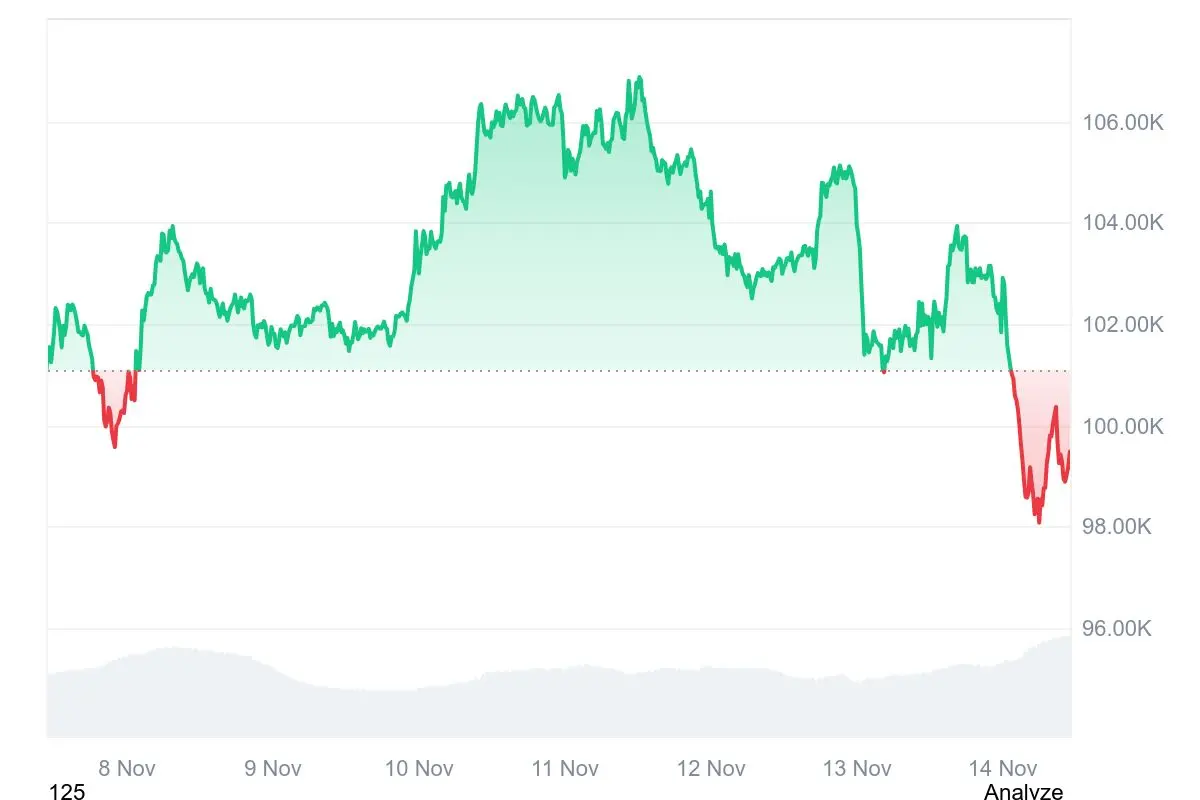 价格主要运行区间约为 $98,000–$107,000,11 月 10–11 日曾多次冲击 $105,000–$107,000 阻力位未果,最高11月11日左右曾一度上探至约 $107,244,11 月 12 日收回至 $103,000 附近(约 $102,480–$103,811 区间)。11月13日短暂下跌回调后,在11月14日美国交易时段出现闪崩,价格再次急速下破 $100,000 下方,至约 $98,000–$99,000 区间,最低到$98,077。现在仍旧缓慢回调中,截止截稿时点价格为$99,484,还未突破$100,000大关。