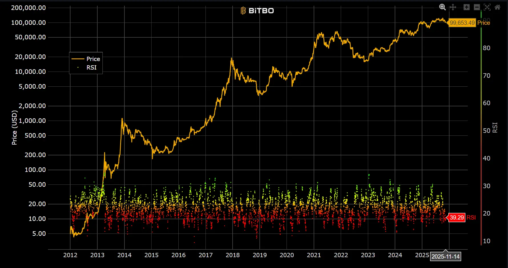 11月14日期间,比特币价格重挫,在美国交易时段闪崩,价格再次急速下破 $100,000 下方至约 $98,000–$99,000 区间,最低到$98,077。现在仍旧缓慢回调中,截止截稿时点价格为$99,484,还未突破$100,000大关。市场情绪恶化,风险偏好退潮。