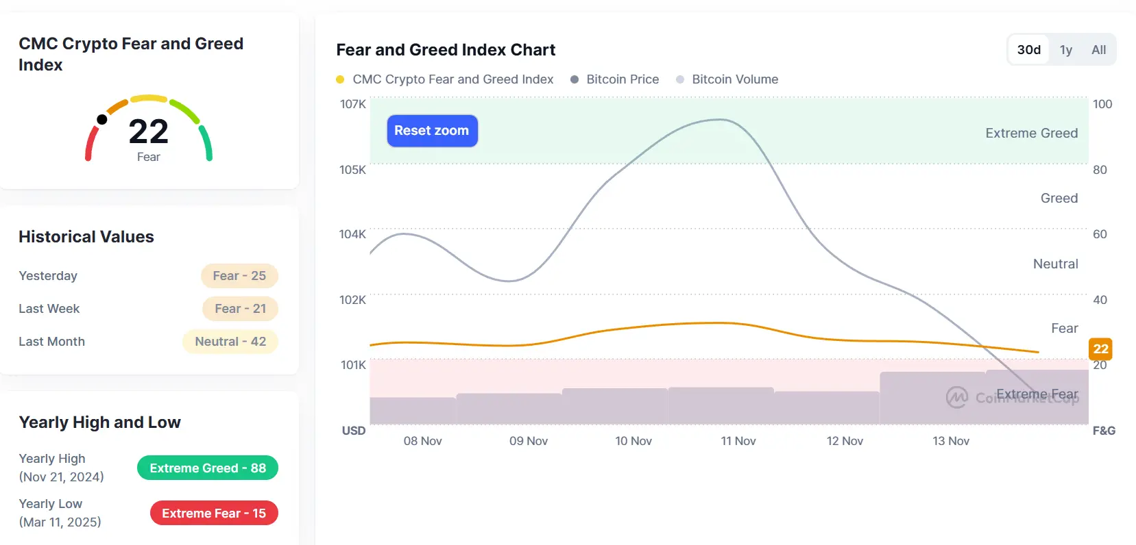 截至11月14日,「恐惧与贪婪指数」约为22点,处于“极度恐惧”区间。
